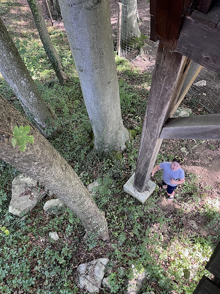 Wij verbleven een aantal nachten in een boomhut, die in de zomer natuurlijke verkoeling heeft door het stukje bos waar het in staat. Het is fijn wakker worden, letterlijk tussen de vogels en de moeflon schapen die onder de circa 20 meter hoge hut scharrelen. Deze 4-persoons hut heeft een 2-persoonsbed en extra slaapplaatsen op de mezzanine. Dit is alleen niet geschikt voor jonge kinderen vanwege de steile trap.