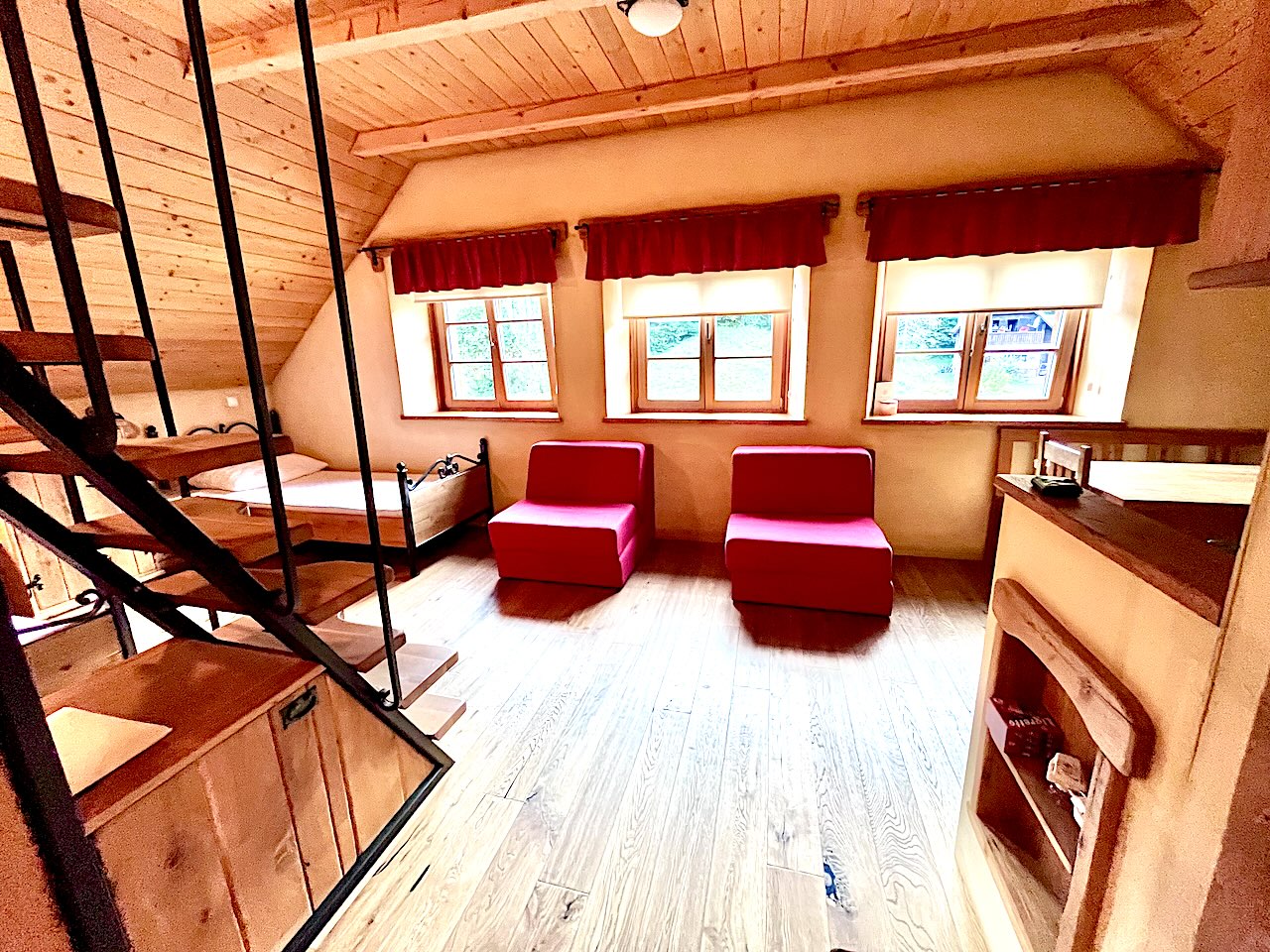De omgeving is heel rustig; hier geniet je echt van de stilte en de natuur. De zes appartementen bestaan uit authentiek houten interieur en zijn ruim opgezet, evenals het terras en de bijbehorende tuin, die naadloos overgaat in het bos. Ook een mooie locatie om te bezoeken zonder kinderen.