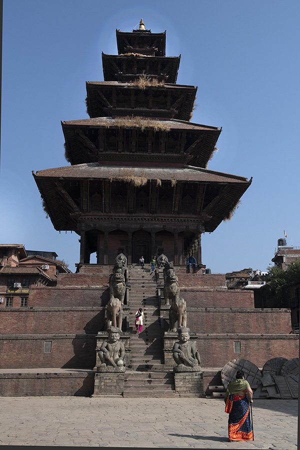 Een letterlijk ander hoogtepunt is de (hindoe)tempel Nyatapola op Tamaudij plein. Deze tempel (1702) is met 30 meter de hoogste pagode van het land en telt bovendien vijf houten etages boven de statige stenen trap. De trap is daarnaast rijkelijk omringd door goddelijke figuren en beesten.