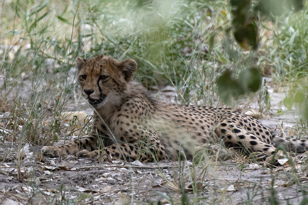De moeder houdt ons nauwlettend in de gaten, maar is wel relaxt. De jongen kennen de auto nog niet. Ze kijken wat schichtig om zich heen en wanneer hun moeder in beweging komt, lopen ze er wat zenuwachtig in een drafje achteraan. Lettie reageert telkens direct wanneer de dieren in een hogere versnelling lopen. Op gepaste afstand draait hij de auto bij zodat we ze goed kunnen zien. We blijven ruim een half uur bij de cheeta’s en nemen afscheid als het viertal onder een boom in slaap valt.
