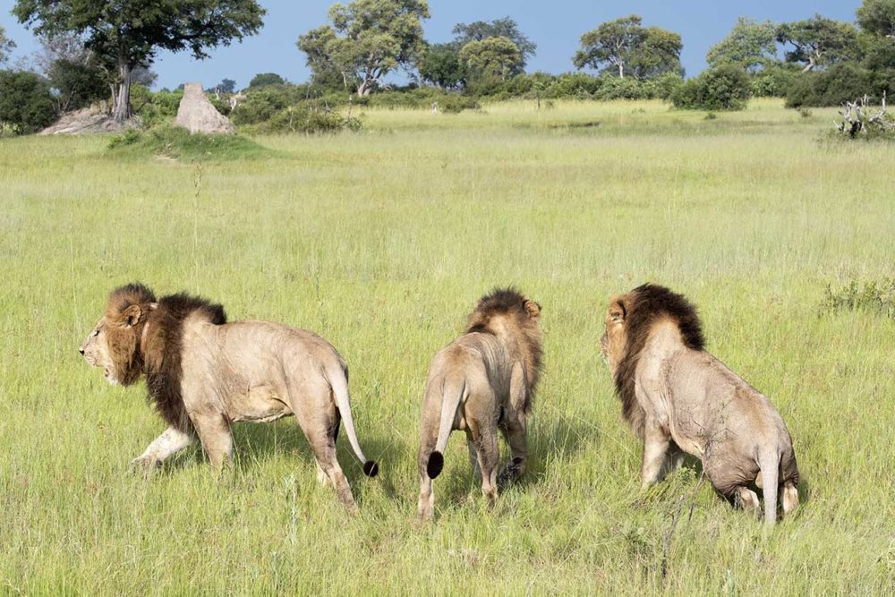 Het einde van onze trip door Botswana nadert. De laatste game drive dient zich aan. En die wordt ook memorabel. Ook nu stuiten we op leeuwen. Dit keer zijn het vier broers. In overleg met Lettie besluiten we de tijd te nemen en bij de leeuwen te blijven. Eén mannetje houdt de boel een beetje in de gaten. De andere drie liggen ongegeneerd lui naast elkaar. Ze hebben hun poten lieftallig over elkaar heen geslagen. “Deze jongens zijn heel hecht. Ze jagen en eten samen”, fluistert Lettie. Hij vervolgt: “Ze zijn nu drie jaar. Alleen wanneer ze gaan paren trekken ze zich terug en kunnen ze mogelijk dominant worden naar elkaar.”