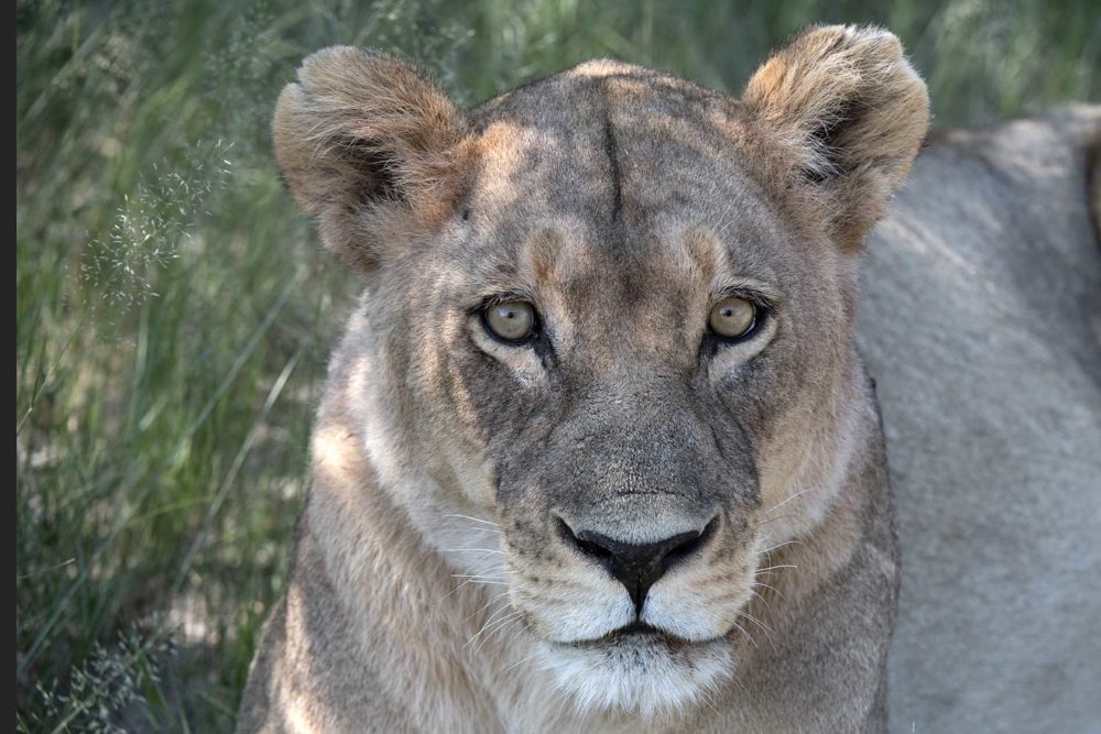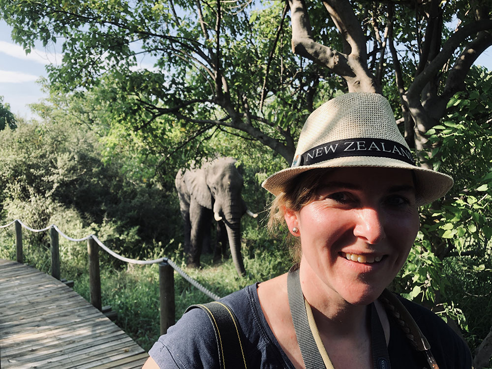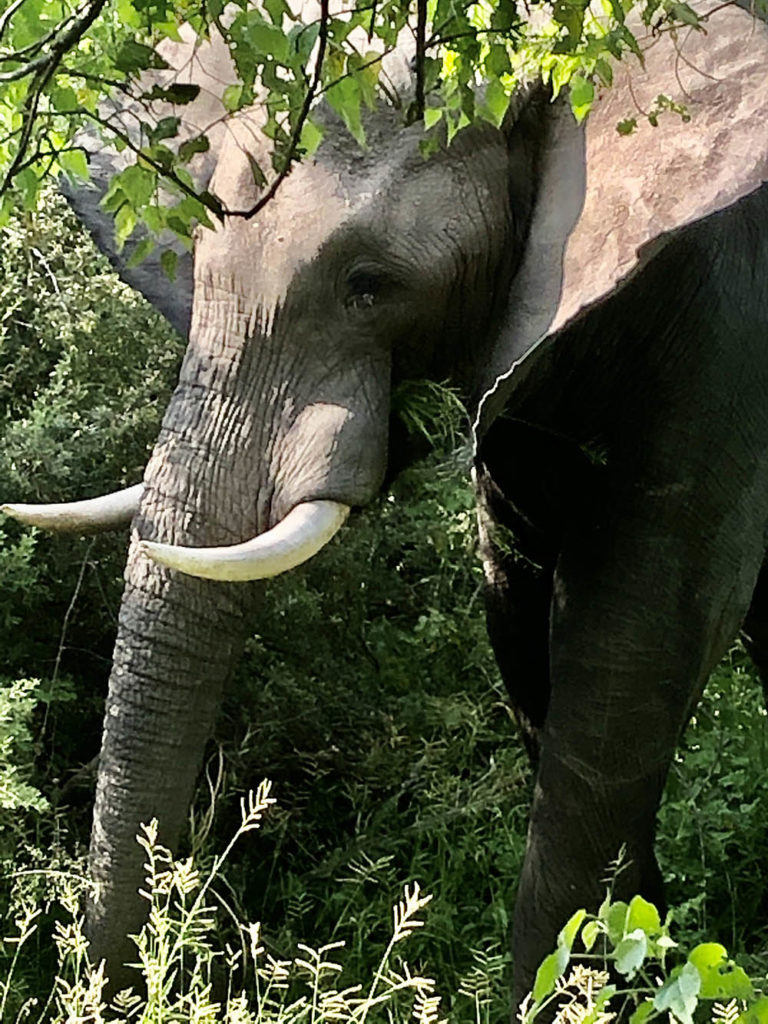 We wachten een paar minuten totdat de olifant zich omdraait. Maar dat gebeurt dus niet. Anneri grinnikt en uiteindelijk klapt ze in haar handen. Ze jaagt niet graag dieren weg, want wij zijn te gast in hun leefomgeving. Maar veiligheid van de gasten staat boven alles. Met lichte tegenzin verdwijnt het dier in het struikgewas. Het nuttigt zijn lunch een stukje verder op. De adrenaline glijdt langzaam uit mijn lichaam. Al snel blijkt dat dit één van de vele grijze kolossen is die we van dichtbij kunnen bewonderen. Want ze zijn met velen tegelijk.