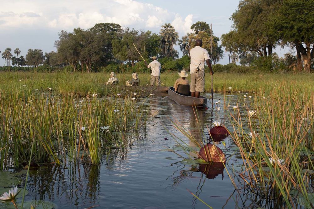 En dat zien we zelf ook wanneer we in een mokoro stappen. Deze traditionele uitgeholde boomstam dient van oudsher als het belangrijkste vervoermiddel in de delta. Inmiddels zijn de houten exemplaren vervangen door duurzame, lichte fiberglas kano’s. De stuurman brengt met een lange stok het bootje in beweging. We glijden kriskras tussen het hoge riet en langs ontelbare papyrussen. Vanaf het waterniveau zien we kleine insecten voorbij vliegen, kikkers van bladeren af springen en kleine ijsvogels een duikvlucht nemen. Het ondiepe water is helder en voelt warm aan.
