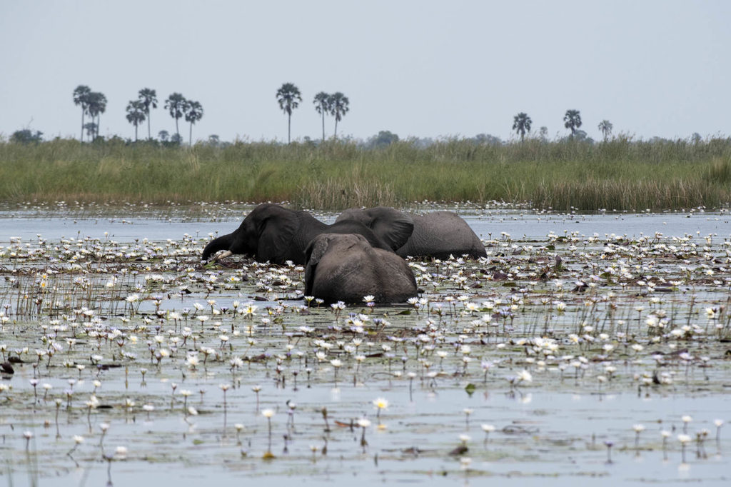 Terug naar Linyanti. Dit sprookjesachtige gebied van 28.000 m2 ligt aan de rand van de vruchtbare Okavango oase. Het vormt een dynamisch kleurenpalet, met spectaculaire vergezichten over het levendige waterlandschap. Er is altijd beweging. En er duiken overal olifanten op. Tijdens diverse game drives zien we de grijze dikhuiden verkoeling zoeken in de moerassen en rivier. Ze spetteren en sproeien met hun slurven rijkelijk water over elkaar heen, alsof ze samen douchen. Olifanten zwemmen graag tussen een bed van witte waterlelies, dat glinstert in de opkomende broeiende hitte. Af en toe nemen een paar nijlpaarden polshoogte. Als een duikboot verschijnen ze aan de oppervlakte. Ze houden alles met hun sterke reuk nauwlettend in de gaten, om vervolgens even later weer onder water te verdwijnen.