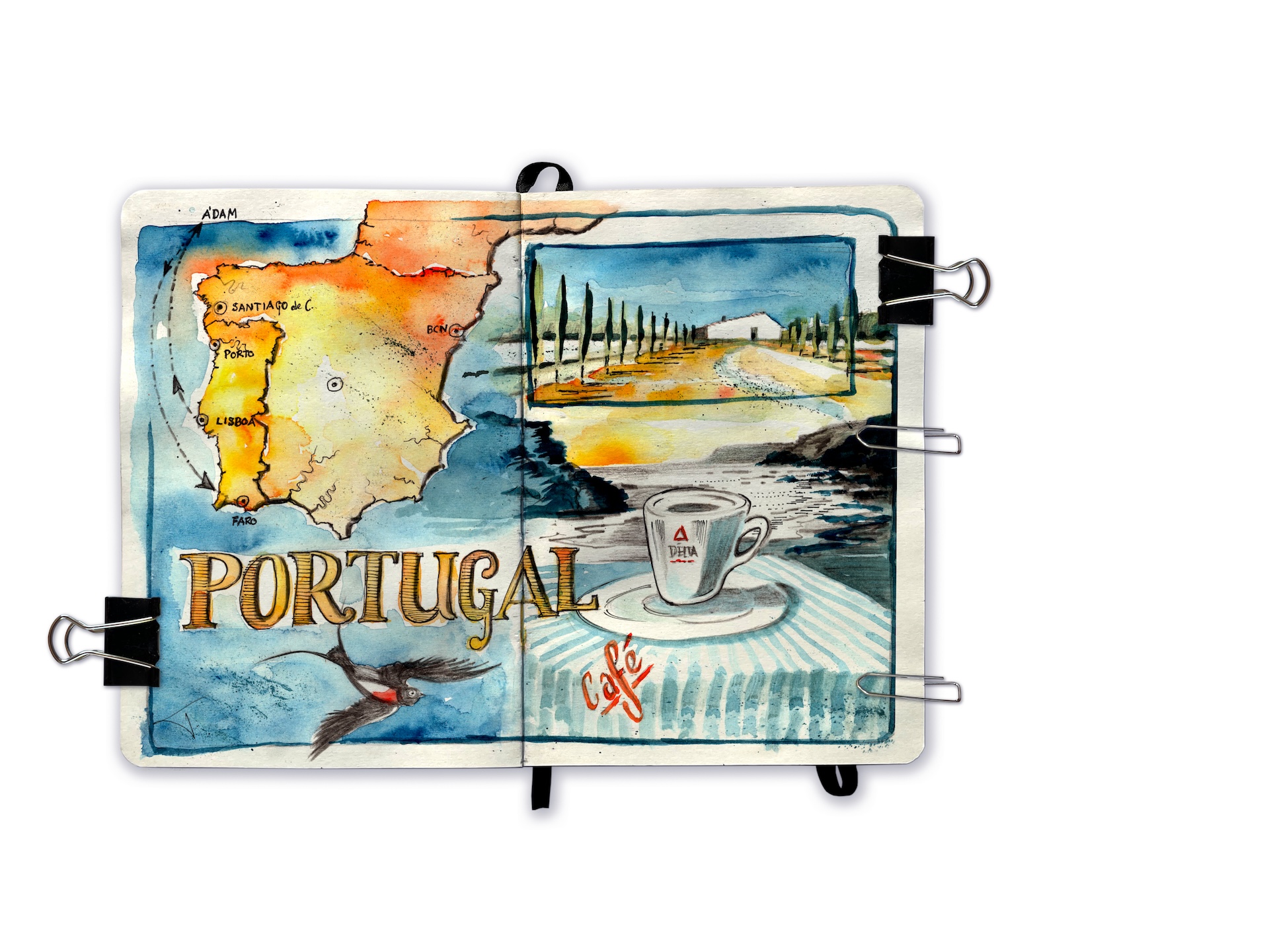 Ook gedurende deze korte Portugese tocht kwamen mijn dochter en ik langs vriendelijke mensen. Er werd ons soms een sinaasappel of een gratis kopje koffie aangeboden door boeren of dorpsbewoners langs de kust. Ook hier haalde ik weer mijn schilderspullen tevoorschijn om een klein schilderijtje ter plekke te maken.