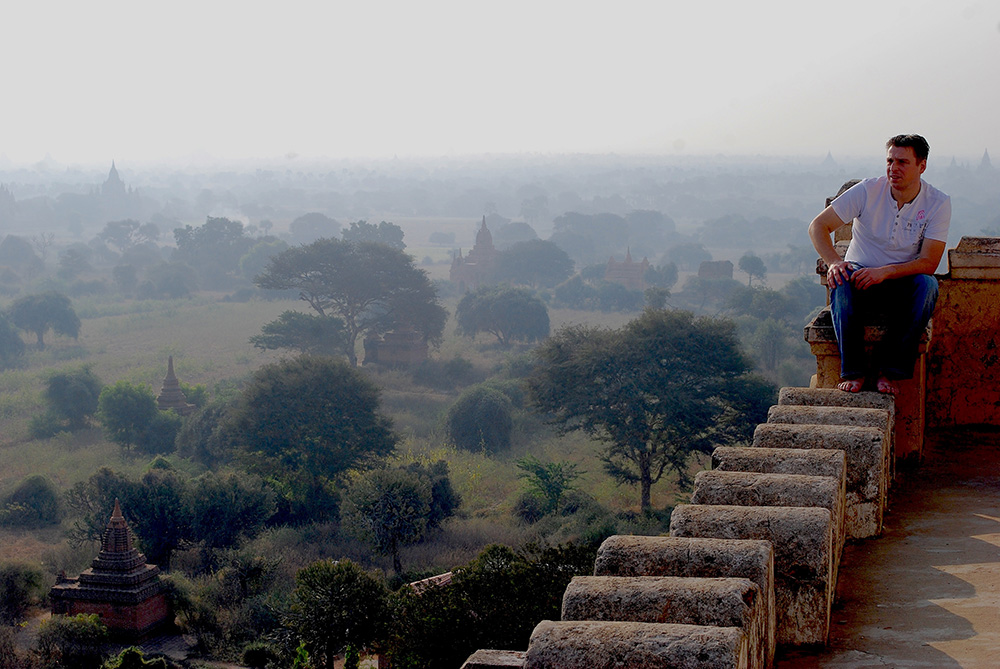 Rond kwart over acht ’s ochtends is er geen kip te bekennen bij de Shwesandaw pagode. “Tegen zonsondergang ziet het hier zwart van de mensen die reizen door Myanmar”, roept Lin terwijl we peentjes zweten om boven te komen. De grote ongelijke treden vragen alle concentratie. De pagode is één van de 2200 nog intacte bouwwerken en dateert uit 1057, de bloeiperiode van koning Anawratha. Shwesandaw is een van de weinige monumenten die nog beklommen mag worden. De meeste bouwwerken verkeren in een te slechte staat of zijn beschermd. Het uitzicht op het bovenste vierkante terras is werkelijk adembenemend. Tot zover het oog reikt staan alleen maar pagodes en tempels aan de hemel. Ze vormen een mystiek stilleven, dat ontwaakt onder een deken van nevel.