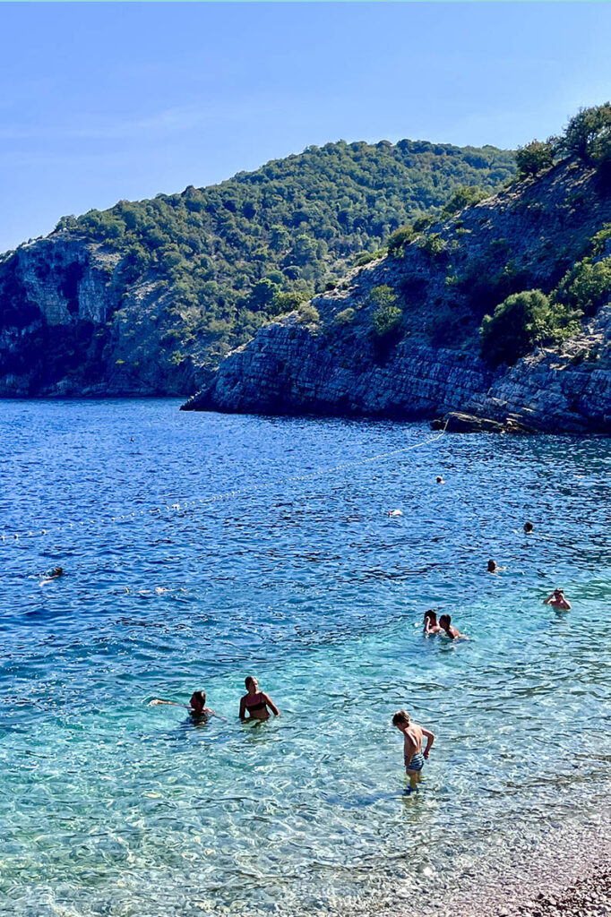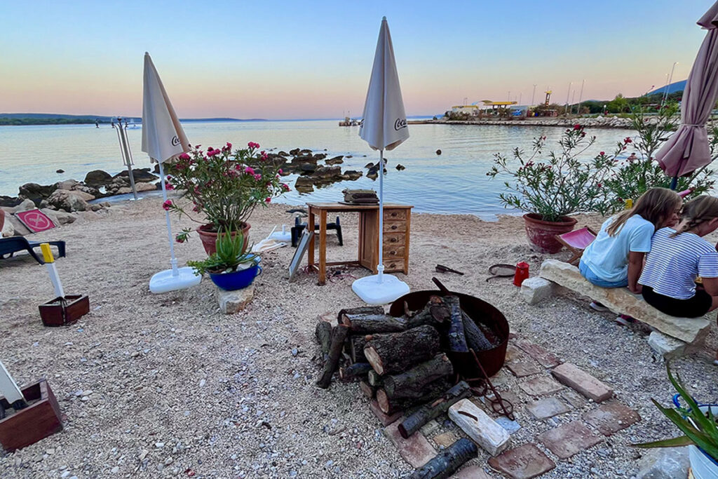 Als we dan toch in het schilderachtige Beli bent, dan is relaxen aan het kiezelstrand onweerstaanbaar. Via een smal weggetje rijden we met de auto helemaal naar beneden en parkeren de auto vlakbij aan het strand. Een Caribische vibe komt ons tegemoet door de zwoele muziek van Bob Marley dat door de boxen schalmt van de gezellige strandbar Pod Beli. We blijven hier een tijdje hangen en drinken cocktails terwijl zoonlief zich in het water vermaakt.