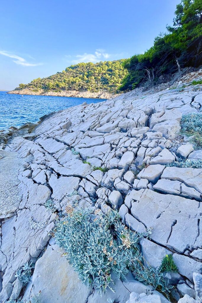 Vanuit de haven struinen we in enkele minuten langs het water en een fijn familiestrandje, waar veel rots- en bospartijen te vinden zijn. We volgen het wandel- en fietspad, dat kilometers kronkelt langs de kust. Na een kleine tien minuten wandelen komen we nauwelijks meer mensen tegen en het weggetje wordt smaller, de beneden gelegen rotsen ruiger. Hier passeren we de fraaie baaien Javorna, Kriska en Jamma en een aantal naamloze baaien. Af en toe zien we een stelletje luieren in de late middagzon. Wat een rust, hier zijn we voor gekomen.