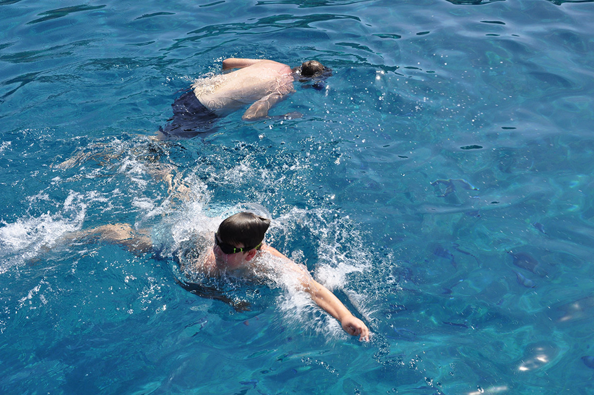 Het naastgelegen strand is helaas wel erg toeristisch, wat komt door de vele hop on hop off boten die aanmeren bij diverse baaien en dus ook hier. Eenmaal in het azuurblauwe water merken we er niet heel veel van. Boven ons hoofd is ook de nodige actie vanwege de zipline van 35 meter die er overheen raast.