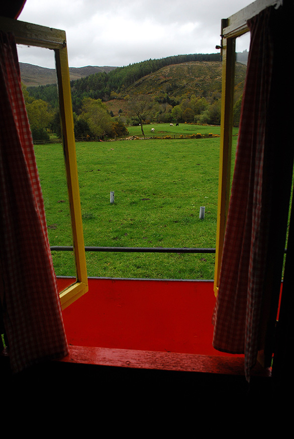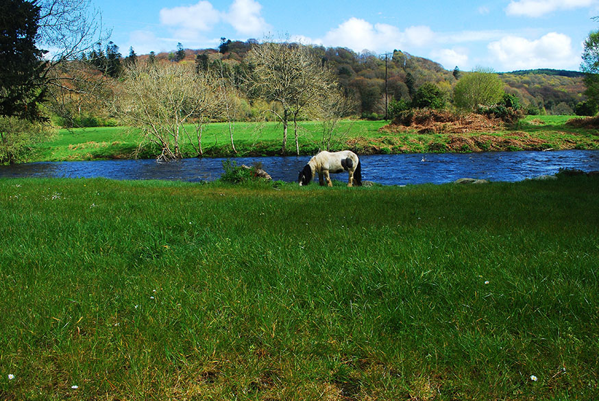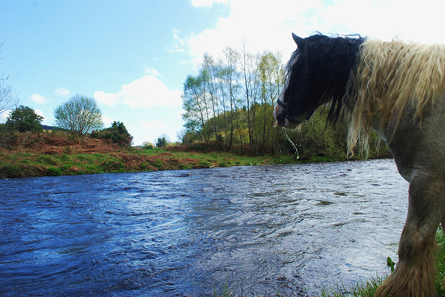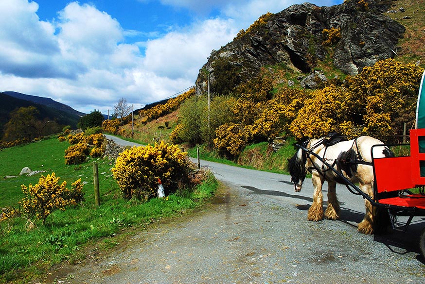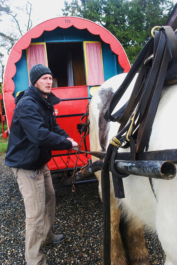 Om volledig te onthaasten en het landschap op trage wijze te ervaren, trok ik als een zigeuner met paard en wagen door dit prachtige gebied. Maximum snelheid: 5 tot 10 kilometer per uur. Voor de groen-rode houten huifkar loopt Buster, een oersterke Irish Cobb (Tinker). Zigeuners trokken tot in de jaren ’80 met dit ras door Ierland heen. Buster trekt zich niets aan van het waterkoude weer van het vroege voorjaar. Hij is het wel gewend. Op de bok kruipt de kou onder de huid, dus neem wel een deken mee en trek een dikke (thermo)broek en jas aan.