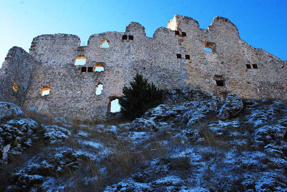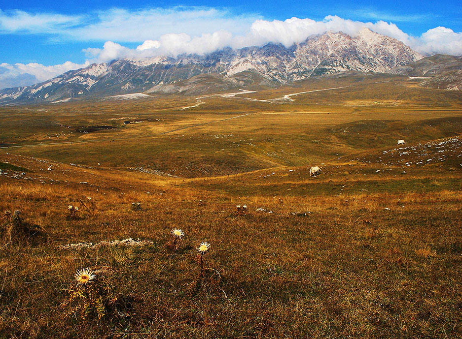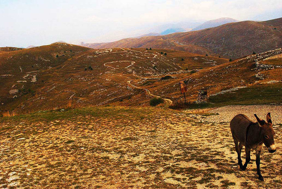 Na een flinke klim is het uitzicht vanaf Rocca Calascico over Gran Sasso Imperatore en Castel del Monte adembenemend. Het dorp vormt het hart van gele en grijze berggezichten die lijken over te vloeien in de horizon. De kronkelende weggetjes liggen er stil en verlaten bij en al dat moois is slechts een van de vele rijmogelijkheden in deze omgeving. In het boekje The Sibyl, the Saint, and the shepherd, van Rodolfo Lorenzi, is ruim 839 (!) kilometer aan ruiterpaden beschreven die dwars door de nationale parken van Abruzzo lopen.