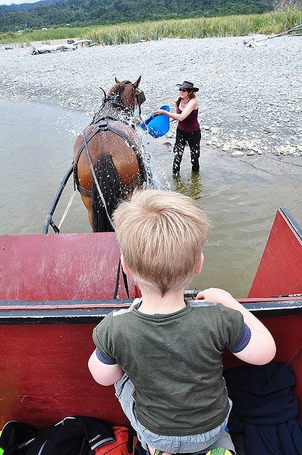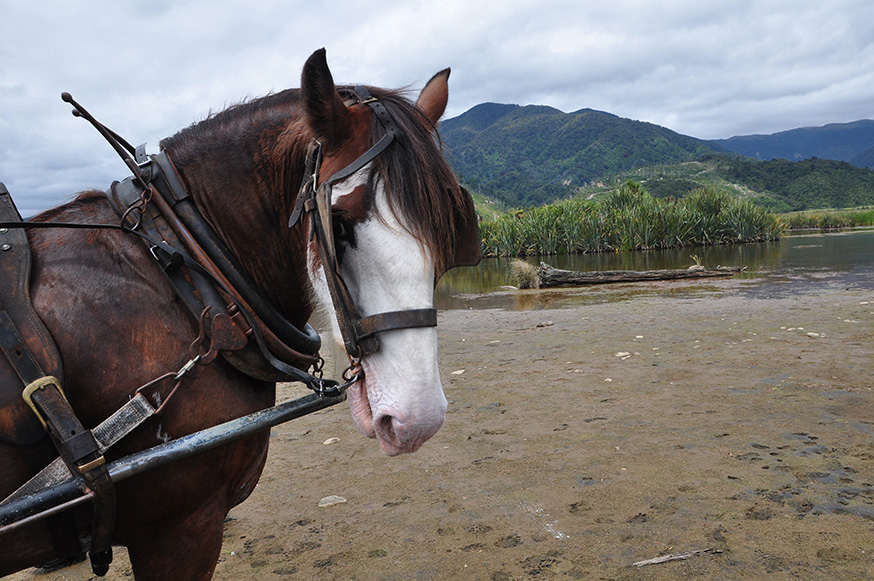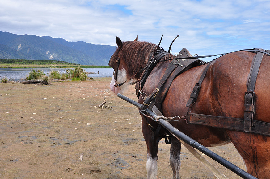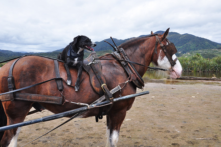 Op het Zuidereiland van Nieuw-Zeeland kun je terug in de tijd met paard en wagen. De enthousiaste Sophie Allen neemt je samen met haar Clydesdale gigant Duke en beroemde hond Pearl bijna drie uur mee op sleeptouw, naar de prachtige en rustige kustlijn rond Glen Road en Barrytown. Toen ik de trip maakte, eind december 2017, liep de zachtmoedige en hardwerkende Murphy nog voor de kar. Helaas is hij overleden. Samen met mijn gezin heb ik een mooie tocht gehad met Murphy.