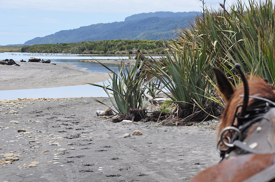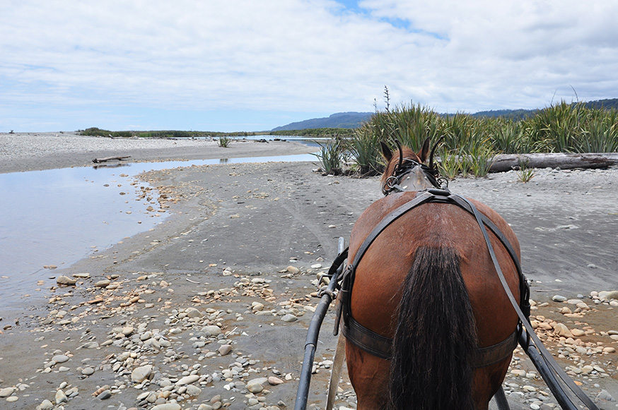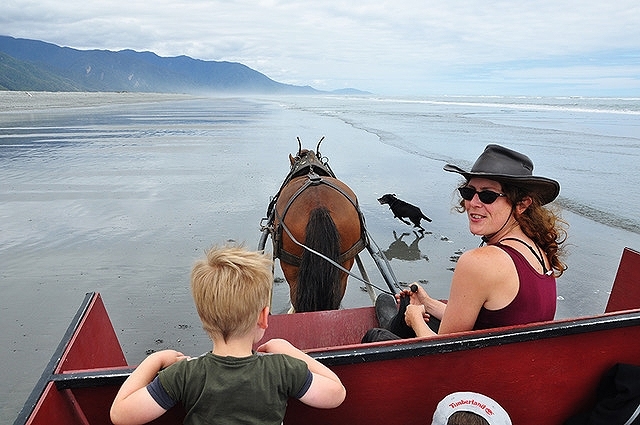 Een paard- en wagentocht van Golden Sands Horse & Wagon Tours kun je goed combineren met een bezoek aan de beroemde Pancake Rocks (Punakaiki), dat slechts een kwartiertje rijden is.