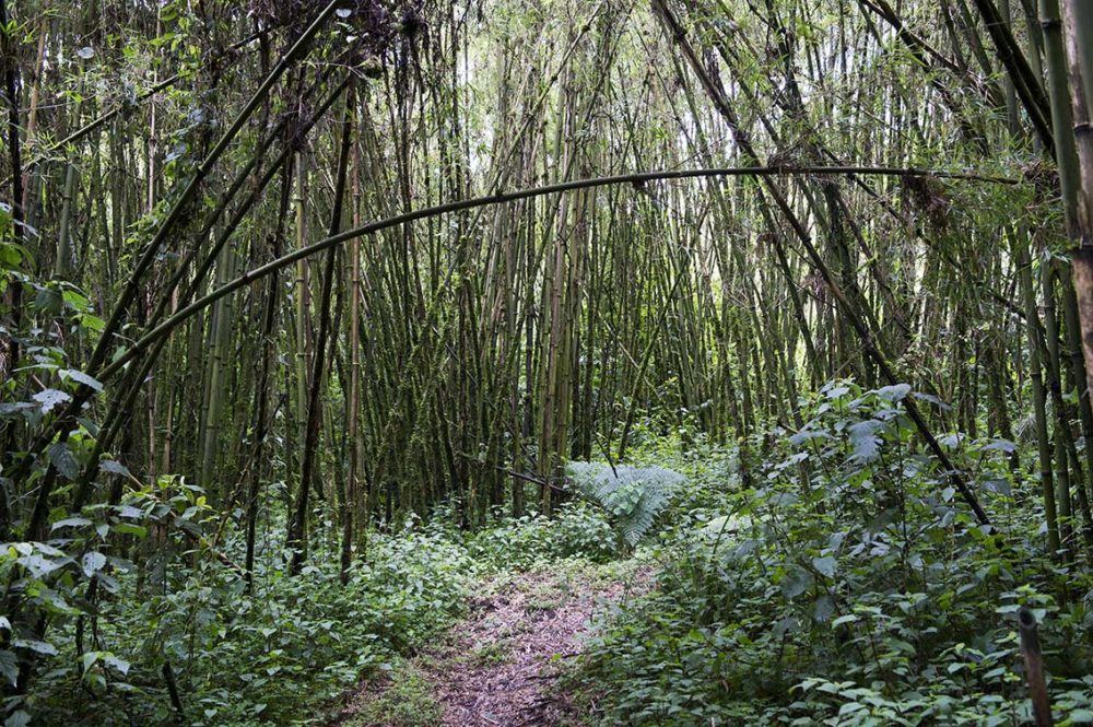 De overgang naar het ‘mikado bos’ van bamboe is het begin van de tweede zone. Deze metershoge ‘stengels’ vormen een mysterieus stilleven, doordat vele planten zijn omgevallen. De lucht is nauwelijks zichtbaar, zo dicht is het bos. Vogelgezang neemt af en de stilte overheerst. Overal hangen lianensliertjes en het stevige bamboe is bedekt met bedjes van mos. De fijne blaadjes op de grond maken plaats voor blubberige drab. “Hier begint het Olifantenpad. Kijk uit, het is glad”, waarschuwt de gids. De schuwe bergolifanten reizen ’s nachts, maar laten met hun keutels en sterke geur duidelijke sporen achter. Ondersteund door een bamboestok, ploeteren we ons door de glibberende modder. Kaplaarzen zijn hier onmisbaar. Even niet opletten betekent onderuitgaan. “Nu ruik je in ieder geval lekker”, grapt de gids. Henk is uitgegleden en zit onder de poep.
