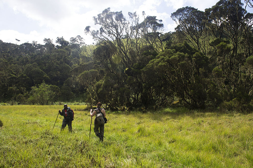 Uit het niets verdwijnt het bamboe en verschijnen de sprookjesachtige Chionanthus virginicus, beter bekend als ‘Old man’s Beard’. Deze lange mosachtige draadjes doen denken aan een lange baard, vandaar de naam. Na een half uur verdwijnt het olifantenpad en steken we kleine riviertjes over. We bereiken de andere kant van de heuvel, waar de prachtige Rukenga vallei zich openbaart. Hoge moerasachtige grassen hebben de overhand, aangevuld door Old man’s Beard bomen. Aan de rand van de vallei stroomt een alpenriviertje. Het lijkt het vredigste plekje op aarde, een waar paradijsje.